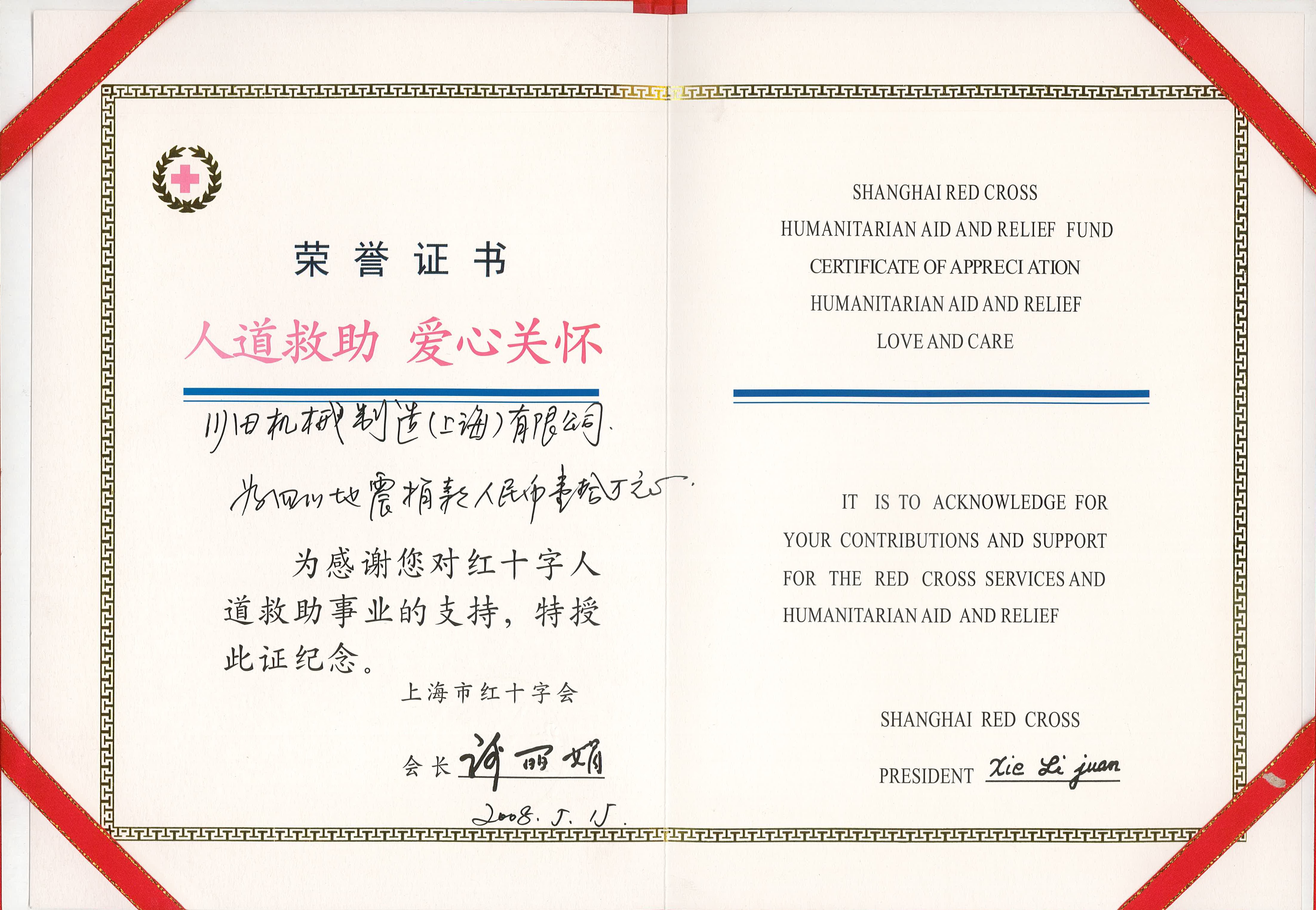 2008年度上海市赤十字栄譽証書-川田株式會社